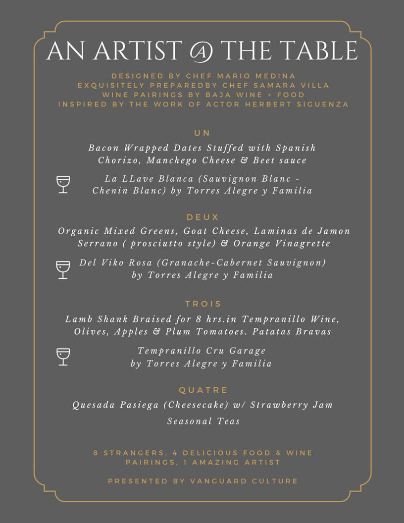 - An Artist @ the Table is an intimate dinner series that introduces the general public to San Diego’s creative community by inviting 12 strangers to share in a delicious 4-course dinner with a prominent local arts leader. Featured Artists’ backgrounds range from photography to architecture, fashion, theatre, sculpture, dance and more. Featured Chefs are tasked with creating a menu inspired by the work of the artist. Wine pairings generously provided by Baja Wine + Food. Early ticket purchase is highly recommended. $100.00 – $175.00 / 21+ only.
