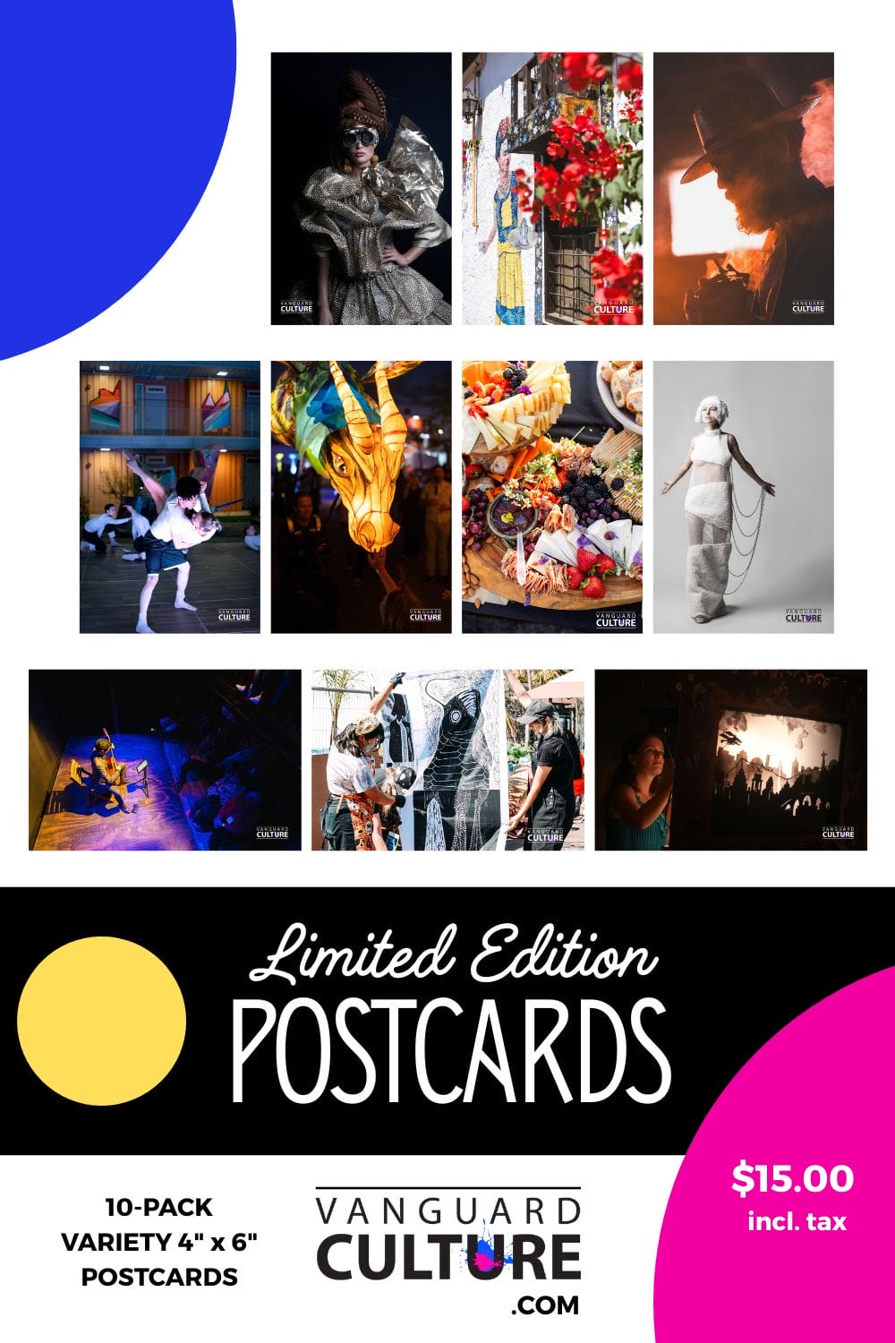 (includes sales tax + postage within the continental U.S.)Celebrate a decade of bold creativity with a limited-edition set of 10 high-quality 4" x 6" postcards, each featuring stunning imagery from over 10 years of award-winning Vanguard Culture programming — from immersive performances and culinary art experiences to avant-garde fashion and boundary-pushing installations. Perfect for gifting, collecting, or sending inspiration into the world.