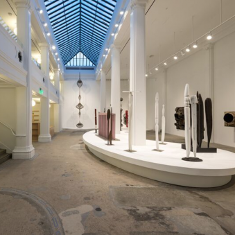 Also represented in the exhibition are the women artists who followed during the decades of the 60’s and 70’s including Eva Hesse, Lynda Benglis, Sheila Hicks, Magdalena Abakanowicz, and Gego who were noted as post-minimalist artists who used process oriented materials and methods using wire, latex, rope, organic and natural materials like saplings and earth, and ephemeral materials like wax and paper. Through stacking, layering, pouring, cutting, draping, gouging, weaving and intertwining, these artists investigate multi-dimensional space, non-archival materials, and intuitive processes of art-making that created both physical and psychologically challenging works. Artists representing works originally created in the decades of the 80’s and 90’s, saw a transitional shift from more object based works, to an expanded use of space into making installation-based works. Liz Larner, Marisa Merz, Isa Genzken, Cristina Inglesias are part of this Post-Modernist era exhibited in this show.