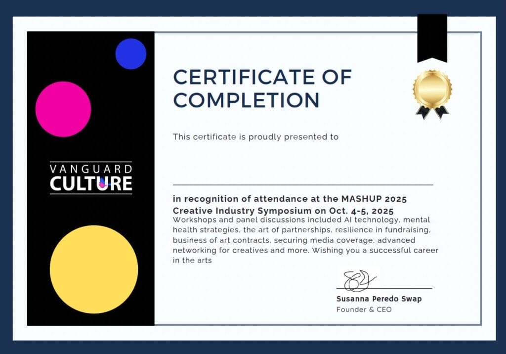 Advance your creative career on your own time. Watch at least 15 MASHUP sessions and receive a Certificate of Completion from Vanguard Culture’s FORUM Series.