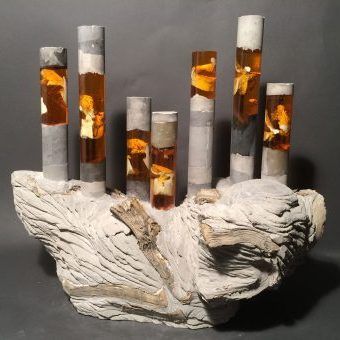 The space next to the painting is occupied with the gray sculptural landscapes of Miya Hannan. She was actually out of town during the reception so we didn’t have the chance to meet. However, it wasn’t necessary. I spent the most time with Hannan’s pieces. The golden tubes are reminiscent of fossilized amber. They cast shadows you can only really appreciate if you crouch down to a child’s eye level. And that was my favorite part. It was Land of the Lost’s cavernous rock meets Jurassic Park’s mosquito-discovery. Even though I was initially confused at seeing Hannan’s pieces, they are the ones that made me lean in and investigate further. It was rewarding. And this is when my insecurities about not being an art academic began to erode.