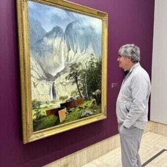 In the 1864 painting, Bierstadt leads the viewer into a pleasant, verdant, valley with the Yosemite Falls looming in the background. A small camp looks inviting at sunrise, morning light filtering through California oak trees. Half of the camp is shaded by the Yosemite dome, while the other half forms a sunny background where the mighty Yosemite Falls flow into a mild body of water (not pond not river) perfect for the expedition party to bathe or water their horses. One man in the foreground is still in his blue sleeping bag, while others cook coffee over the open fire, and several men warm their hands next to the peacefully grazing horses. Nothing bad could happen in this idyllic scene. Who wouldn’t want to be there, and glance in awe up at this natural wonder? Any indigenous people, who may lay claim on this verdant valley have been carefully omitted. This is a propaganda painting, and Bierstadt took poetic license to present it as appealing as possible. “It is an idyllic view of nature, at a time when the society of the United States was torn apart by the Civil war,” Derrick Cartwright, curator of the Timken remarks.