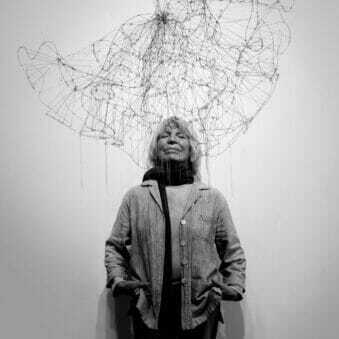 Looking closer, it becomes apparent that the complex pieces have been constructed with cable wire, carefully unraveled and re-arranged in a delicate web of possible connections. Expertly lit, they look airy, light and playful at first, but turn out to be the result of an elaborate process taking from one to three months per sculpture to create. At her studio on a compound in Fallbrook, CA, Anne Mudge tames the tension and compression of silver wire to create balanced mobiles, seemingly defying gravity. Suspended from a single point, the sculptures interact with the environment: the air flow makes them turn, the light reflects off the silver wire and the beads casting dancing shadows.