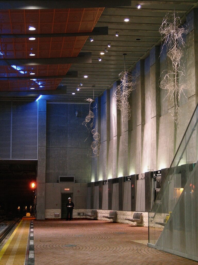 Entering Quint Gallery in La Jolla, an intricate organic-looking shape with red beads floats at eye-level, seemingly blocking the way. The glittering sculpture is entitled Hub, and it consists of stainless steel, pigment, red beads looking like berries, and tendrils reaching out into space. It is not alone. Twenty other sparkling, moving, turning sculptures populate the space at various heights and levels. Anne Mudge, the lively artist with a gray bob and a dog named Bean, weaves between them and points up at one small wire structure shaped like a seed pod, hanging high on the ceiling, “This was a study for the Trolley station commission in 2005.” The large-scale version of Mudge’s Taproot series can be seen at the SDSU trolley stop.