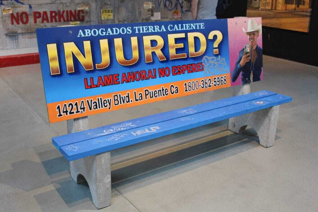 This play asks – Are you injured? In the current political climate, this question has become central to one’s relation to society. It reminds me of artist Alfonso Gonzalez Jr.’s series of advertisements on public benches with iconic symbols of urban America. The signs invite the viewer to reflect on the liminal senses between the emotional, mental, and physical states of non-White Americans, especially the Latino and Chicano cultures in LA..