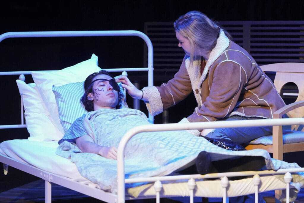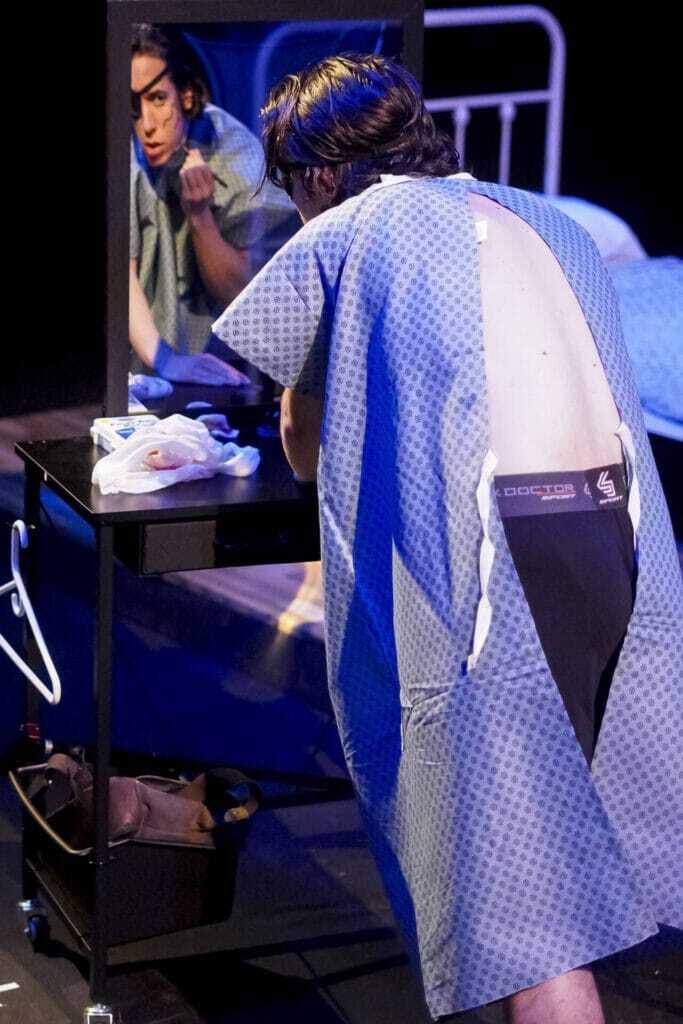 We have this interesting interplay where she is the person who is there for him in those times, and this creates a vulnerability between them that allows them to open up. And then we get to see when is she able to respond to that vulnerability with vulnerability of our own. And so the physical Injuries act as sort of a time clock for us, on where are we in time, [and] what is going on. And it allows us to, and I think the reason the playwright has centered on it is that it allows us to visualize the emotional wounds.
