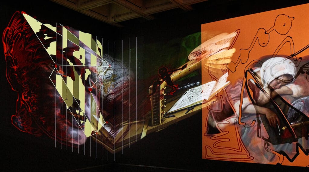 Malani never shies away from blunt and honest truth. When offered a fellowship at the National Gallery in London, she was asked to create a body of work based on European paintings from the Gallery’s collection. First, she asked to choose the pieces she wanted to work with, and then “can I defile them?”. The resulting work, My Reality is Different, exposes the abuse of marginalized people that underpins European society. The viewer steps into a fully immersive space where hand drawn animations transform along every wall. The ethos of European excellence is deconstructed as the master European works change color, fragment, and disappear.