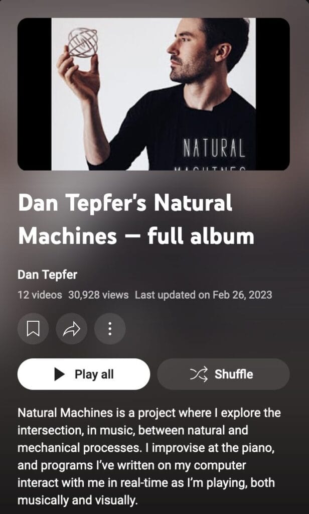 DT: It depends on what the program is. For Natural Machines, there’s a lot of improvisation, and the preparation is really, for me, it’s just really going back into the code and just trying to move it forward. I stayed up all night a few nights ago and just was adding features and tweaking little things. I keep trying to make it better and better. Every time I come back to it, there’s just a long list of things that I wanted to do.