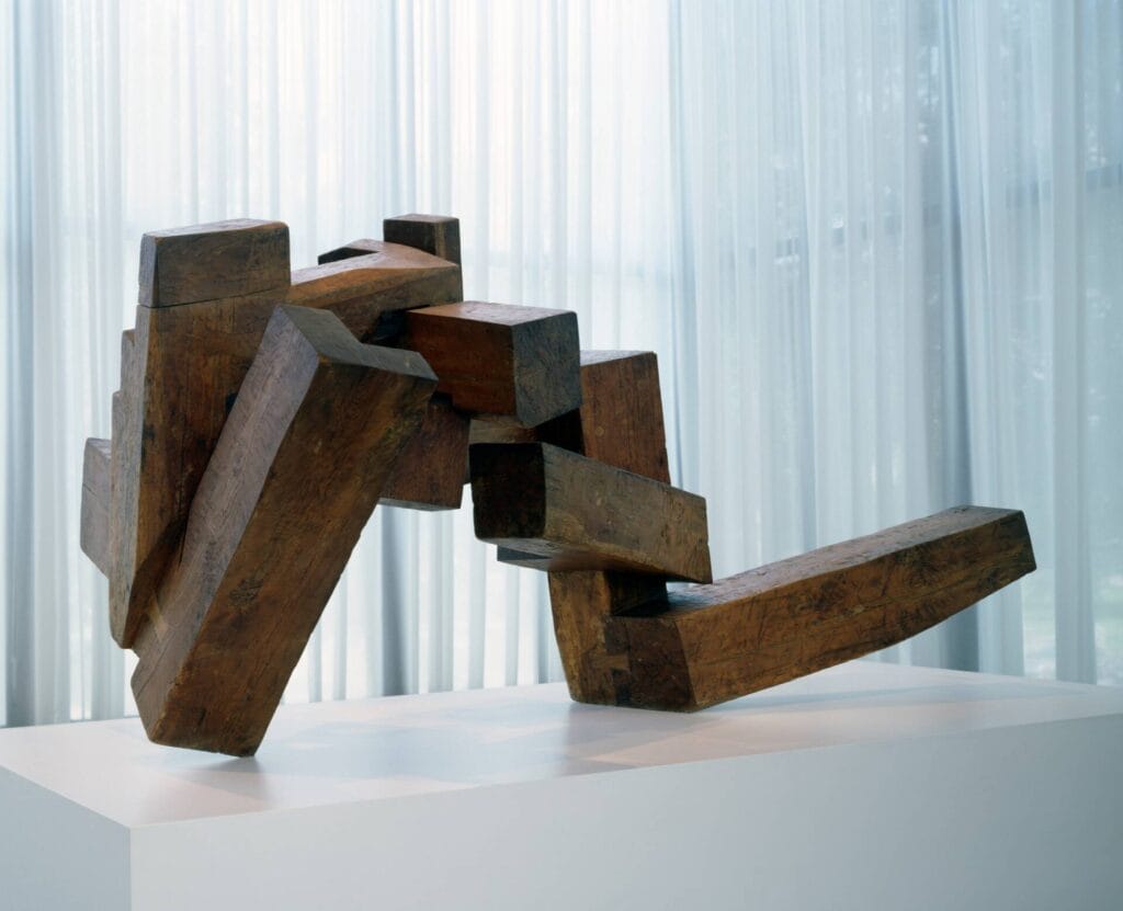 The oak works of the 1960s mark a pivot. Jans describes them not as detours but as thresholds. Wood allowed scale; scale allowed architecture; architecture allowed the question Heidegger called dwelling. These beams—once structural supports in Basque buildings—are reassembled using traditional joinery, with no concealment and no tricks.