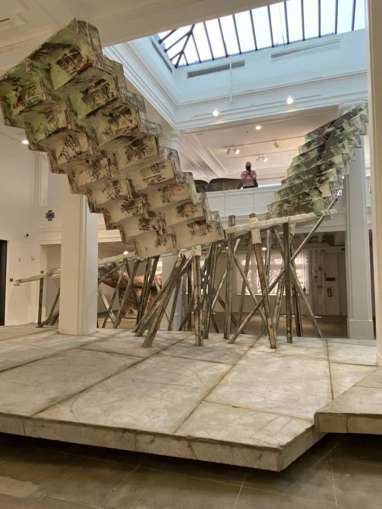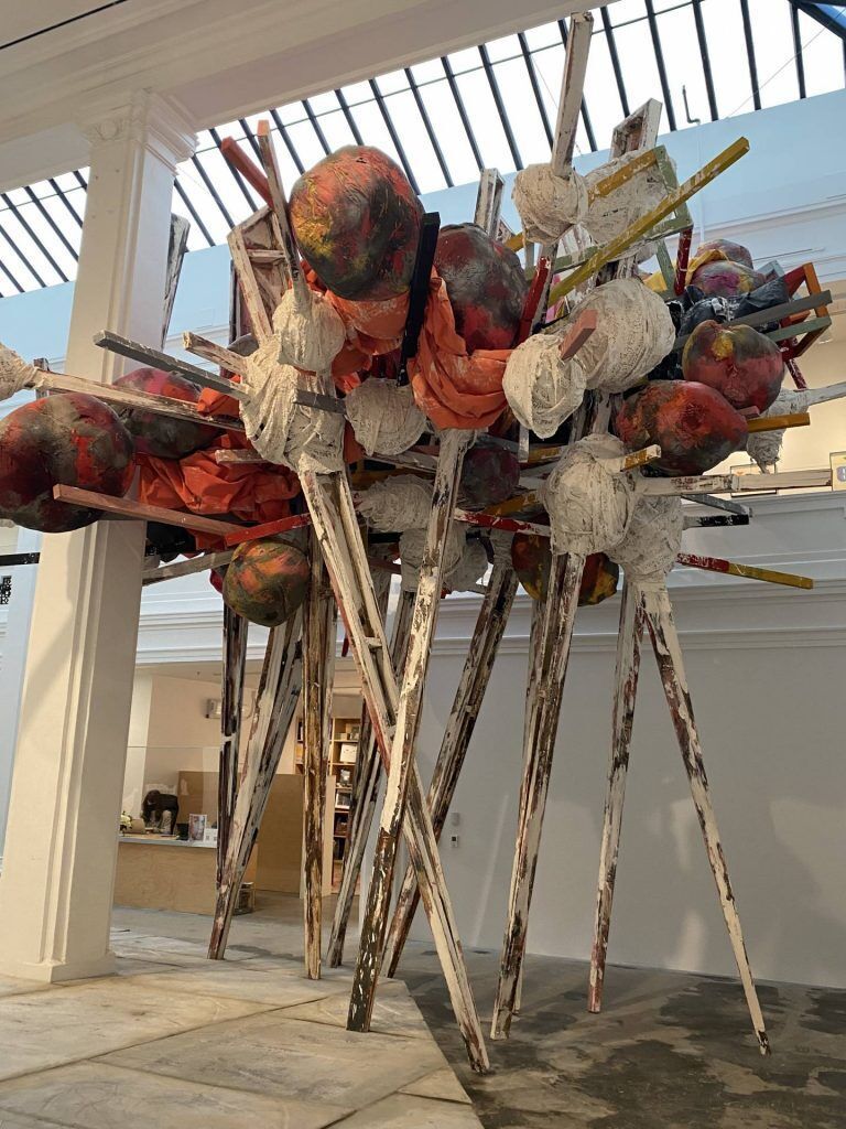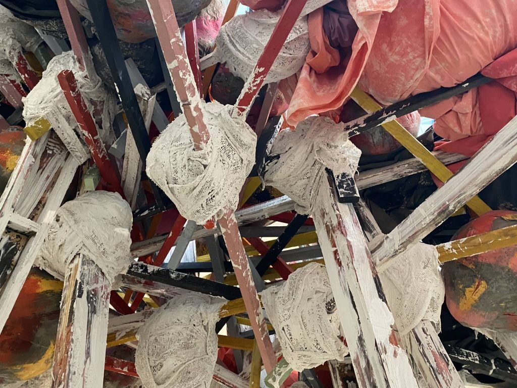 Barlow’s sculptural installation in Hauser & Wirth’s South Gallery challenges the confines of a Neoclassical space of immense columns and 21 foot ceilings and a second story mezzanine with a confrontational aggressive energy that encourages the audience of viewers to explore. Upon entering the space, we wonder if we are in Barlow’s strange dream world as viewers walk around and under and look up and over the sculptures – in the center there is a cement multi-level low stage which prohibits visitors from traversing the surfaces. There is a structure of stilts supporting two staircase-like forms suspended and seemingly climbing into space and going nowhere. Nearby, a cluster of very tall partially painted wooden poles and cement draped scrim and vibrantly painted fabrics of sphere-like forms of varying sizes are placed at the top. Also nearby is what looks like five large dark gray scrim flag-like forms appearing to have been toppled over with their poles cemented into the cylinder forms that once help them up.