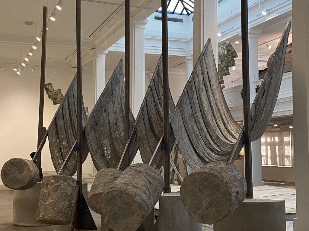 The South Gallery’s upstairs mezzanine includes a collection of smaller floor and wall-mounted works. These works are organically shaped forms of textured and painted cement and are suggestive of figures. The mezzanine allows for the viewer to see both the smaller forms and glimpses of the first floor monumental sculptural forms simultaneously.
