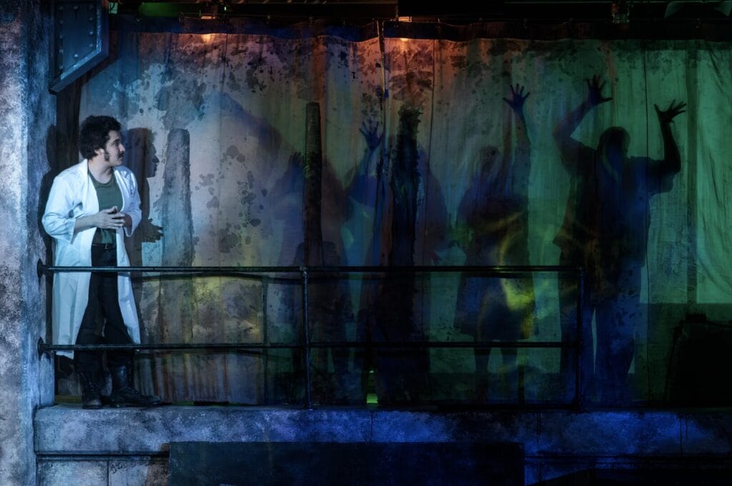 Lovely Salima Gangani‘s Johanna and magnetic Sam Castillo offer a stark contrast to the otherwise grim cast of characters. Gangani’s soprano cuts through the darkness while Castillo’s vibrant stage presence balances a world consumed by bloodlust and madness. The role of Johanna represents innocence and purity, and the two lovers remind us beauty and love still exist amid horror.
