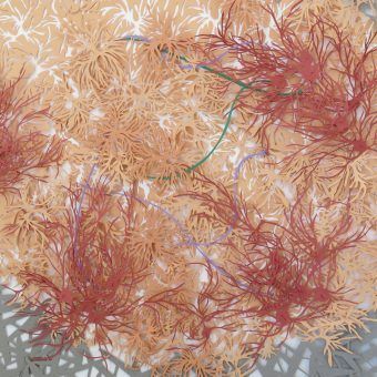 The circles do not so much interlock as they sit in semi-connectedness, trying to close gapes in the mesh, much like a physically compromises brain tries to restructure its pathways. The Gage Lab’s work of repurposing skin cells into elements like neurons is echoed in the varying embroidered circles which seem to reach out to each other in an attempt to create and repair networks, much like the Gage Lab’s work on brain cell dysfunction. For Surai, who has had to try multiple solutions to chronic pain, the Gage Laboratory’s work appeals to her because “Instead of calling my brain cells resistant to treatment, it would start with my experience as a standard which I think helps retain a degree of agency in a really dehumanizing process.”