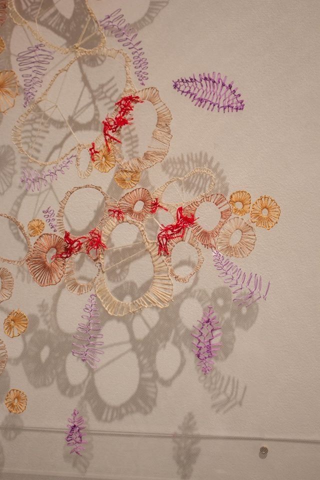 Surai’s work, Untitled (after Vadodaria), inspired by her time with Rusty Gage and Krishna Vadodaria of the Salk Institute, is an assortment of delicate open circles embroidered in different colors across a mesh suspended on an acrylic panel and hung so that the shadows enhance the stitching