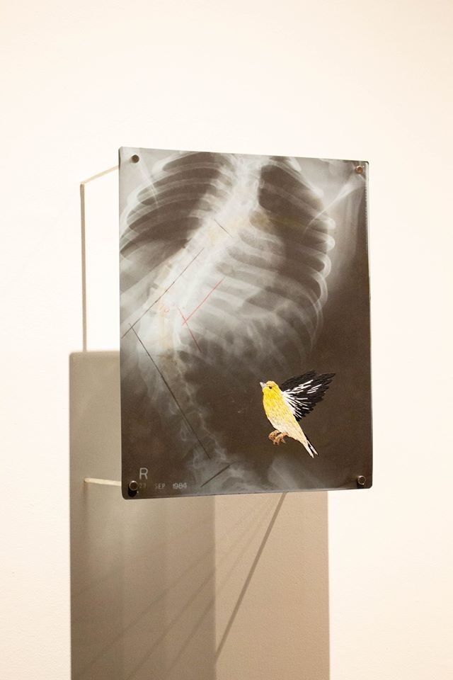 Shadows and self-knowledge inform the works created by Bhavna Mehta and Akiko Surai. Mehta, whose rise to prominence with intricate cut-paper installations has been swift, worked with Samuel Pfaff of the Salk Institute on a project of particular interest-how the spinal chord is affected by injury and disease. Stricken by polio as a child, Mehta’s resulting piece, Fault Lines, is deeply personal. Mehta uses hundreds of pieces of colored paper, pinned in place with 700 pins to create a 20-foot cross section of a spinal chord, complete with labels of color-coded sections such as the motor neuron. The cross-section “magnified 200 times,” according to Mehta, is a striking piece, acquiring an almost mandala-like serenity as it sits, echoed by its own shadows. To the left of the installation, an x-ray of a convoluted spine, Mehta’s own, plays host to a cheerful yellow embroidered bird. Mehta, who was deeply touched to work with a scientist in this manner, included the x-ray because “it exposes the fact that the story of your life is written on your body.”
