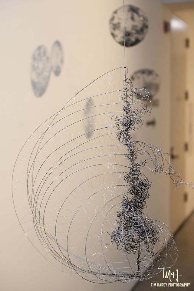 Another installation that looks at DNA is Anne Mudge’s hanging interpretations of DNA packed into nuclei. A multi-media artist, Mudge spent time with Ferhat Ay of the La Jolla Institute for Technology, to create delicate but powerful hanging sculptures of genomic architecture. For Mudge, who describes herself as “long been fascinated by the astonishing architectures built out of natural processes,” this collaboration produced astonishingly graceful forms created from wire, quartz, lead weights and pigment. Effectively silhouetted against the wall, two meter wire pieces are coiled in and over themselves, sometimes as a ball, sometimes as a beautiful shell created along the Fibonacci sequence.