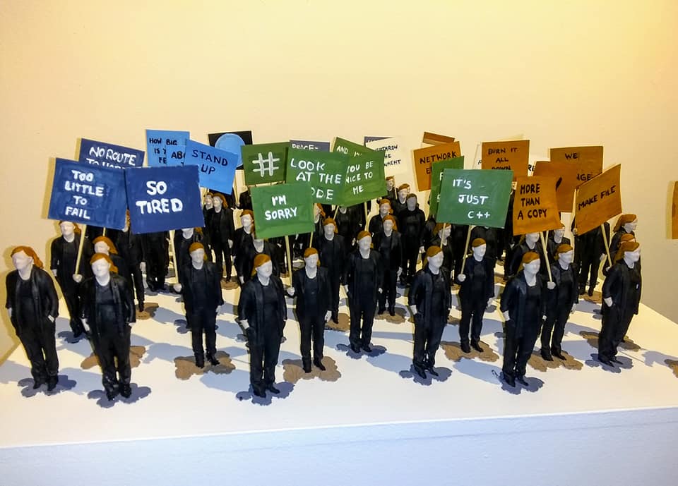 According to SDAI Executive Director Silverman, SDAI chose to add 10 more artists to “round out the show,” and to add more diversity. Situated mostly on the periphery, the work, sans scientist is interesting if not quite in sync with the rest of the core pieces. Among works of note is Trish Stone’s installation, a collection of Little Trishes protesting, (as well photos of them protesting in front of various places in San Diego à la the gnome in Amélie) and two engaging video games. John Burnett’s soundscapes add an interesting dimension with three distinct sound compositions designed to compliment each of the three pillars around which the show is constructed. Lean in and you’ll hear some evocative combinations.