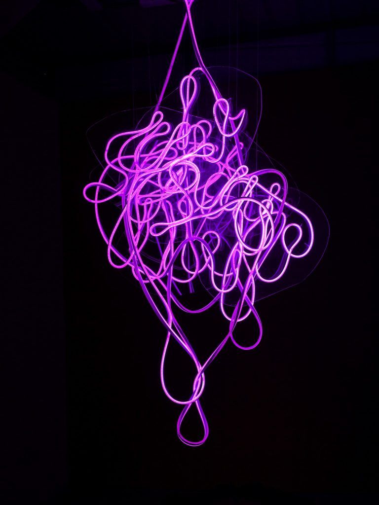 More is Sheena Rae Dowling’s fascinating response to working with Olivier George on the brain and addiction. As someone who has struggled with addiction herself, Dowling said she was deeply affected by George’s work that demonstrates how an experimental compound can shut off the powerful perpetual cycle of withdrawal, offering hope to those working through substance abuse. “Seeing his research felt so validating of the struggle I went through and gave me deep gratitude for my recovery,” said Dowling. More, housed in its own room, is an intricate interplay of metal mesh and fiber optic cables, glowing with various colors and patterns- much like a healthy brain. Dowling invites the visitor to press a button- and see what withdrawal might look like. It’s impressive and not a little bit disturbing at the same time.