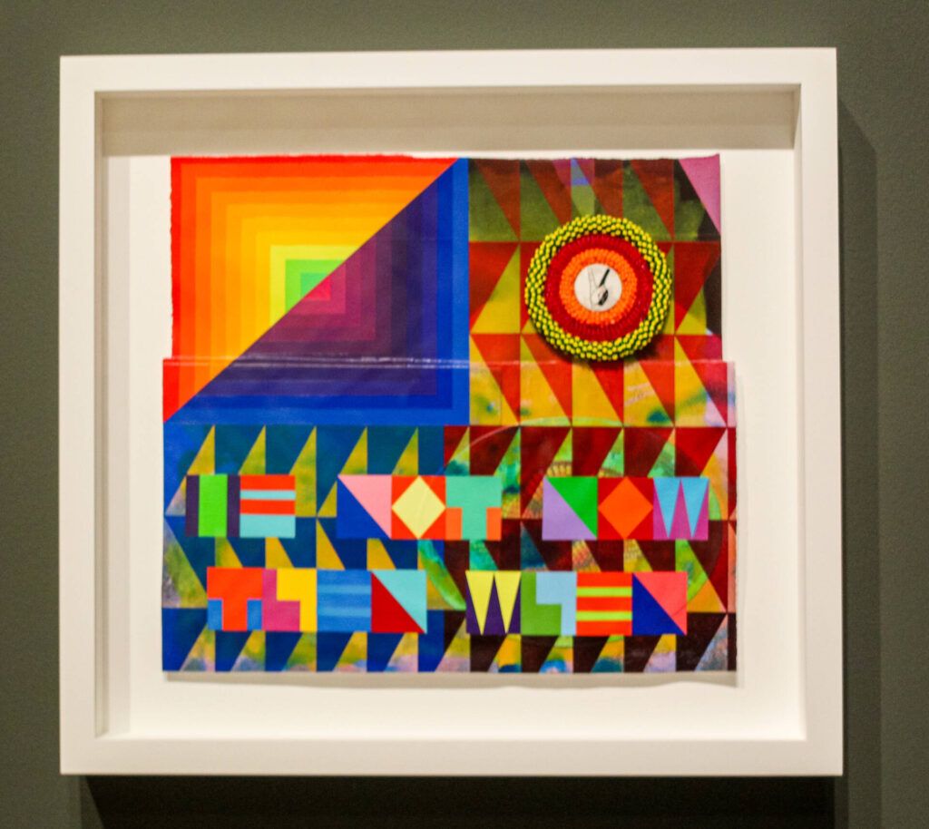 Sarah Loyer, the curator of this show, held a brief discussion with Jeffrey where the themes highlighted the duality of the American cultural history and it’s relation to native peoples and others who have been oppressed over the last 249 to 533 years as well as the duality between the joyous colors used in the work contrasting the divergence of joyousness in “this American life.” Gibson’s work is rooted in both personal identity and heritage. He chooses to present vibrant color, music, and dance to celebrate resilience, joy, and self-expression as opposed to adversity. Incorporating found text and historical references, this work engages with the complicated legacy of oppression and resistance.