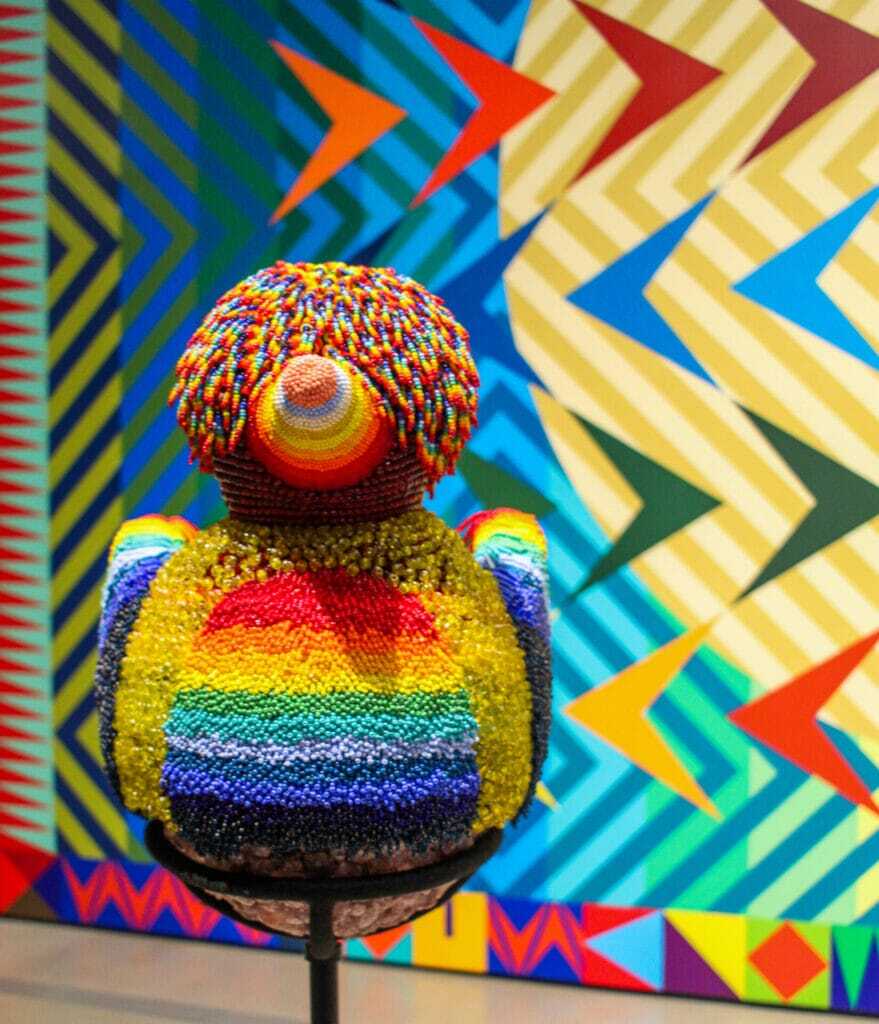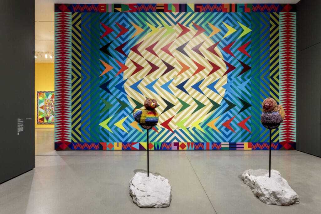 “So this exhibition takes a long view of history and while showing how art practices can be forms of resistance and resilience at the same time, this is evident from the very first gallery that visitors will enter, which you can see behind us here with the two bird sculptures. The behind the birds is a mural, and the mural is titled Birds Flying High. You know how I feel, I think everyone recognizes those lyrics from the song popularized by Nina Simone in 1965.