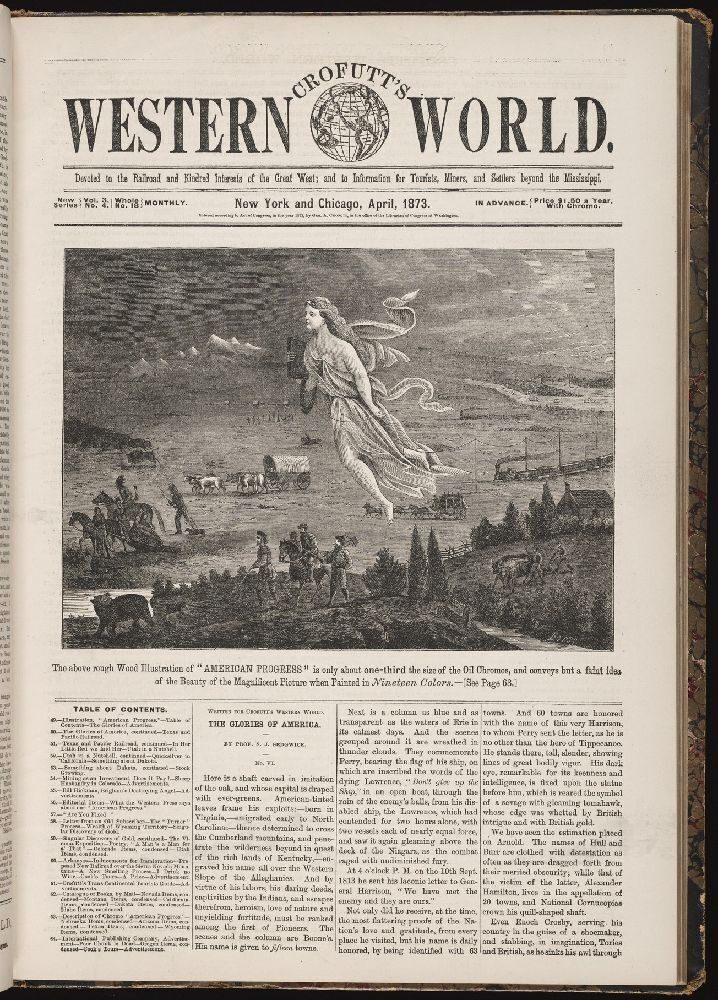 Artists of that period, such as John Gast, were commissioned to create art that promoted the ideas of Manifest Destiny in the 19th Century by demonizing the indigenous peoples and celebrating the overrunning of this land with European cultures. We can now clearly see the false narratives of Crofutt’s Western World. The publication sold itself under the masthead “Devoted to the railroad and kindred interests of the Great West; and to information for Tourists, Miners, and Settlers beyond the Mississippi.”