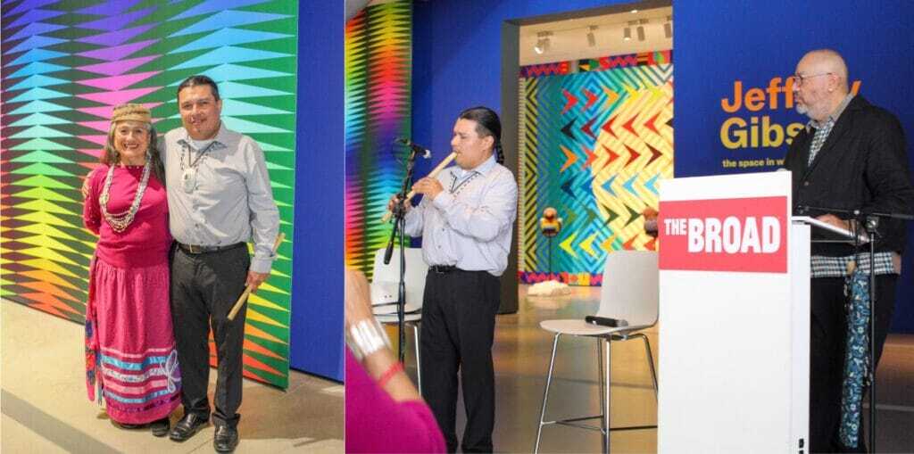In the opening of the exhibition, two other natives from Los Angeles, Lazaro Arvizu Jr. and his mother Virginia Carmelo (both Tongva, Gabrielino) were present to acknowledge the space of this beautiful exhibit as originally tribal land and to welcome both Jeffrey’s work and all those visiting to acknowledge the centuries of presence of the Tongva peoples within the Greater LA Basin. Lazaro played a beautiful piece on a wooden flute that was accompanied by sounds of nature.