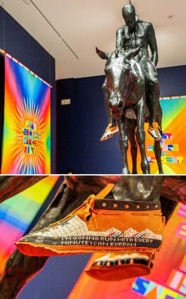 “The flags are hanging vertically inside the galleries and you can see them in their entirety and the entirety of their designs. And they are accompanied by a monumental sculpture, a bronze that was made of the turn of the 20th century by the artist Charles Carey Rumsey titled “The Dying Indian.” In 2019, you made an intervention to that sculpture by commissioning moccasins made for the sculpture to wear, for the Bayport sculpture to wear by the Cree artist, John Little Sun Murie. Can you talk about your intentions with that intervention and why you felt this work would be a powerful addition to the exhibition here in Los Angeles and more broadly at home in the us?