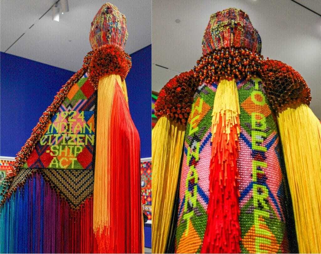 This exhibition offers the wide-angle view that stretches from indigenous histories to foundational US documents and contemporary lived experience and intersections of all of those things and more. The works in the show resist the erasure and marginalization of indigenous and many other communities by being irresistibly joyous. The show’s viscerally, exuberant colors drawn from many indigenous aesthetics and traditions, claim space, and I would argue induce endorphins.