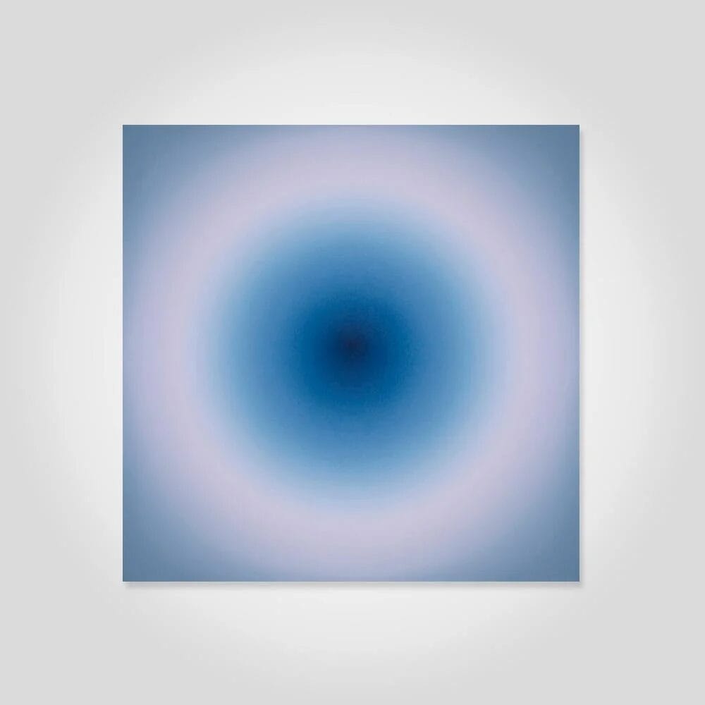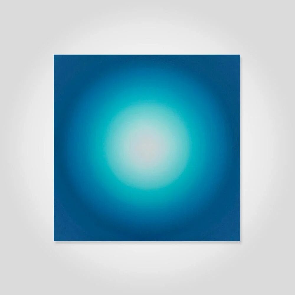 The same reception area contains a series of related paintings, Beginning 1 &2, Hidden Passage, and Hidden in Plain Sight. All feature various shades of blue in subtle graduations. Blue is the color of the sky or the sea, but to Fukuyama blue is also “the color that draws the viewer into the pictorial space.” Like a magnet, the viewer’s glance is sucked into the round blue circular center of the paintings. The surface is so smooth that I couldn’t see the transitions between the hues of blue. Fukuyama achieves this effect by applying very thin layers of paint, and letting them dry completely before applying the next layer on top of the other. She repeats this process, which can a month, until the desired image emerges and feels atmospheric, spacious and hypnotic. “Blue creates a space you can enter and hide,” says the artist. In Hidden in Plain Sight, there is actually a very subtle square hidden within the circle. Barely noticeable, white on white, it forces viewers to look closer and longer, or else they miss it. An intention she shares with Robert Irwin, one of her favorite artists. One of the founders of the California Light & Space movement, he also wanted to entice viewers to spend a longer time discovering each art work.