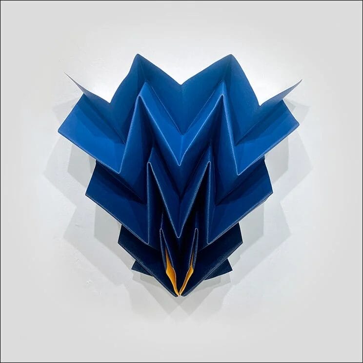 Upstairs a final series of Fukuyama’s work becomes visible. Five works of folded canvas are origami inspired and refer to plants and flowers, such as Elm leaves, Irises, Bellflower, and Kniphofia or Red-Hot Poker, an orange, pointy flower with a yellow base. Fukuyama remembered how her grandmother liked to do origami in Japan and once gave her a bouquet of origami flowers. “I was definitely thinking about my grandmother when I did these pieces,” she said. First the canvas was painted flat and let completely dry. Then Fukuyama pressed them into the shapes she designed for each plant and kept them in shape with iron rods in the back, but they are still moldable. These were her most overtly nature inspired works.
