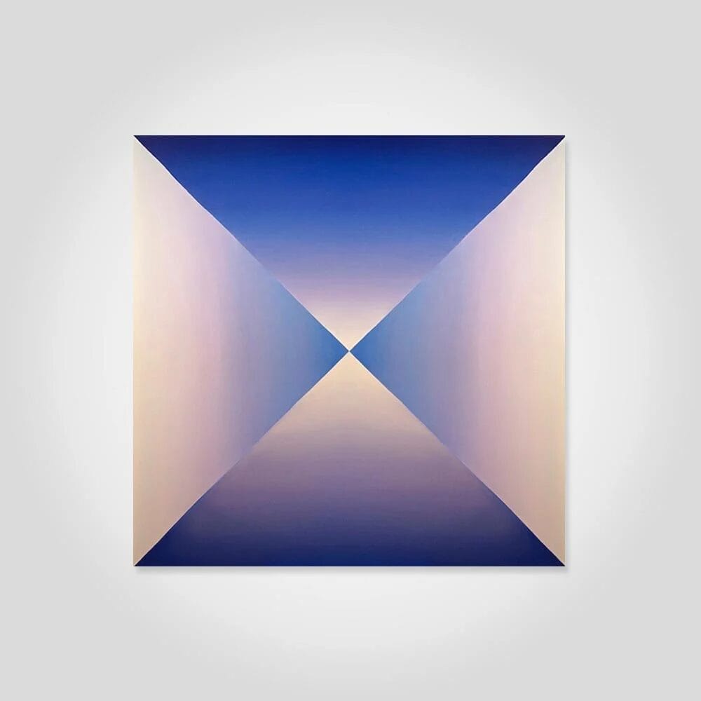 Two paintings entitled Invitation to Infinity and Invitation to Mystery don’t feature circles but instead four triangles meeting on point in the center. They create an optical illusion.