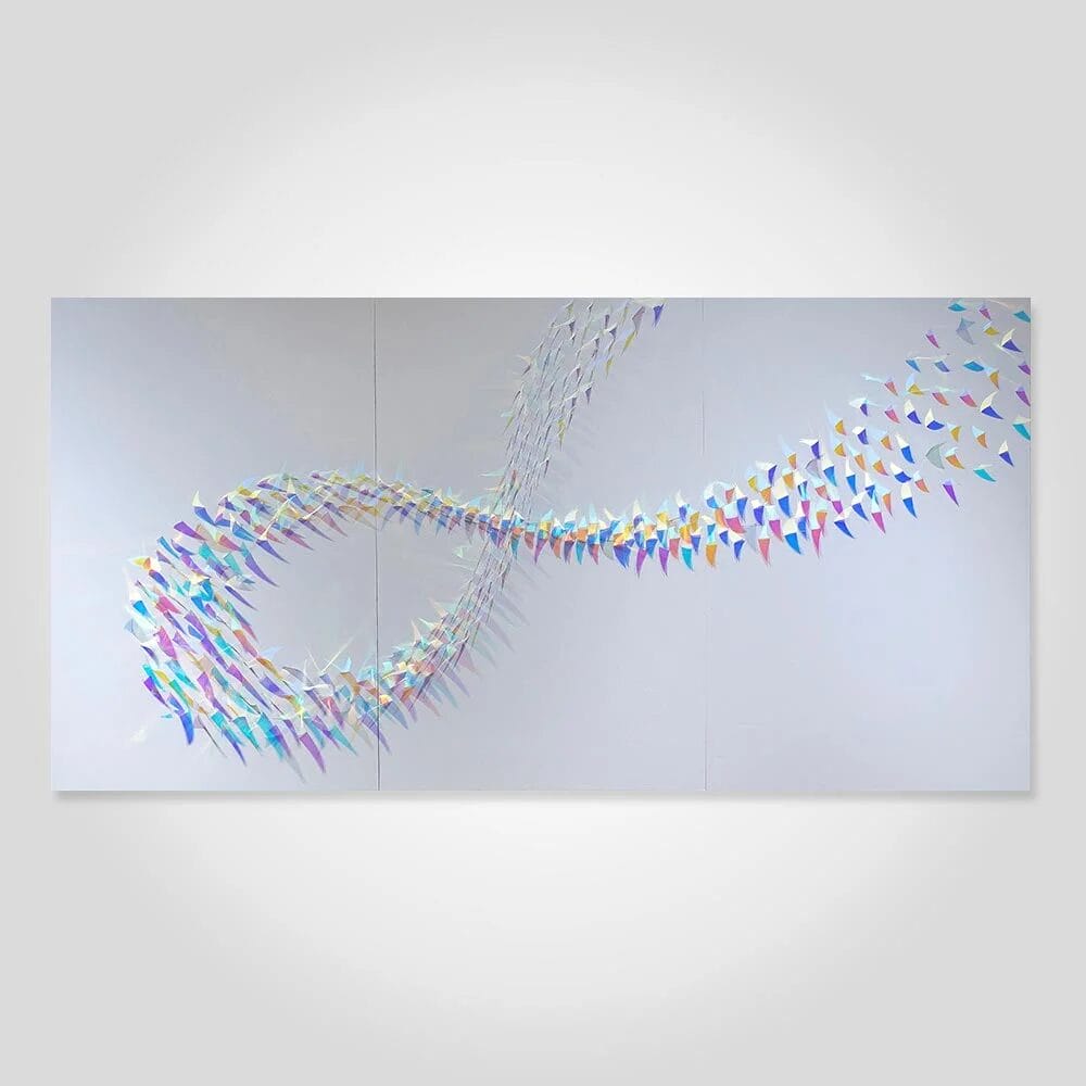 During the Covid pandemic Fukuyama was inspired by the flight of starlings in the sky. How do they manage to configure a cohesive shape? How do they coordinate their flight pattern? Fukuyama told me that starlings only communicate with seven other birds around them. The vicinity of the wingspans, the wind flow of the other starlings allows them to form their flight configuration. The piece seems to move and flow as it changes colors constantly. A larger version of this piece was temporarily installed at the airport, and now found a home at City College.