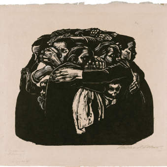 Kollwitz’s focus on both technique and subject simultaneously are demonstrated in her work In Memorium Karl Liebknecht (1920). Liebknecht, the leader of the German Communist Party was arrested and killed and was joined by 100,000 mourners at the grave site. Having witnessed the burial, Kollwitz was inspired – and moving through creating an etching, a lithograph and then finally to a woodcut, which she believed best expressed her intent.