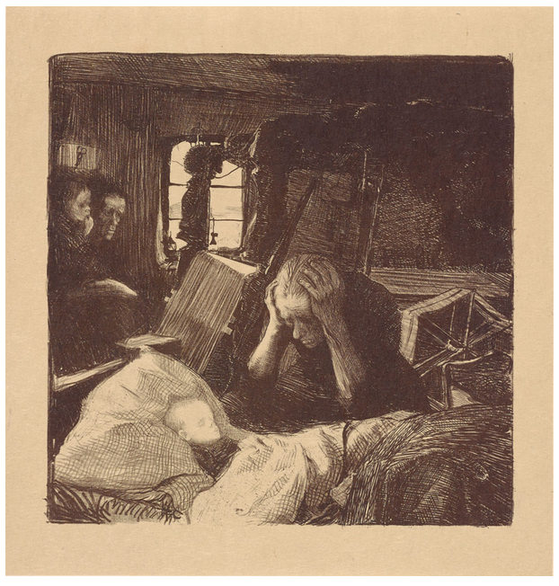Käthe Kollwitz’s 5 decades of art-making took place in her homeland, Germany during turbulent societal change and the devastation of two world wars. Her works document the poverty, injustice and loss she and her fellow Germans experienced during these years – including the loss of one of her sons. Though she began as a painter, Kollwitz found that etchings, woodcuts and lithographs better portrayed her ideas, thoughts and emotions to a more easily accessible and broader audience.