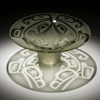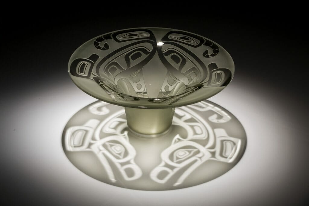 This set Singletary on his path as an artist incorporating traditional Tlingit designs in glass objects. Without an academic art education, but with the help of many mentors in the glass blowing community, Singletary arrived at Pilchuck Glass Studio north of Seattle, where a group of artists created a totem pole in honor of the school’s founders John Hauberg, Anne Gould Hauberg, and Dale Chihuly. Singletary contributed a glass dagger and the traditional flared hat of the Tlingit elders made out of glass. It was a turning point in Singletary’s creative journey. The hat combines traditional Tlingit design in the nontraditional medium of glass. The shadows cast onto the surface reflect the designs more clearly than on the object itself.