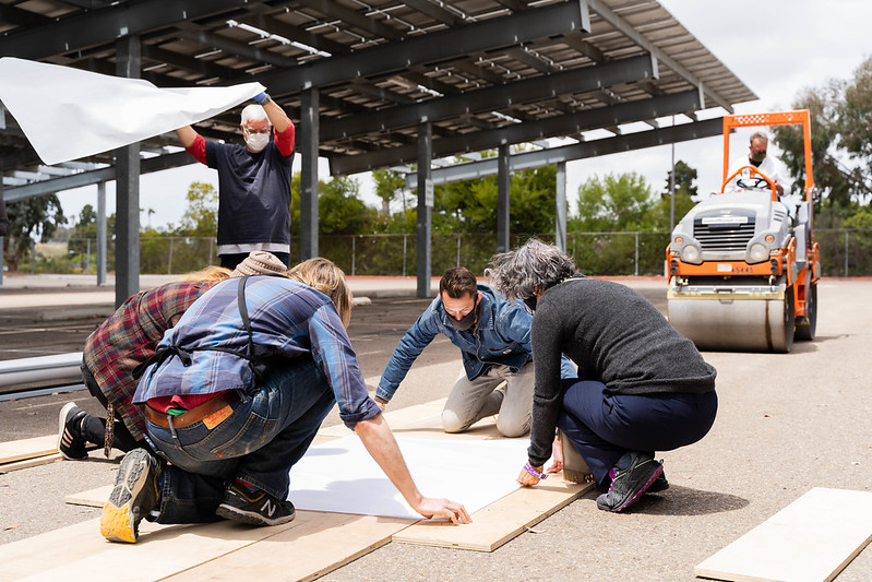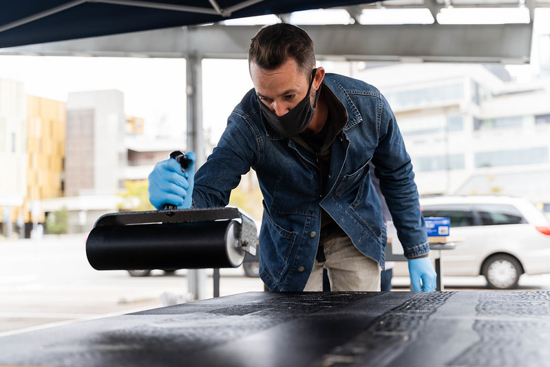 In a private event on April 21, 2021, that took place in a large, vacant parking lot on campus; the making of their “Heavy Duty: A Steamroller Printmaking Exhibition” began.