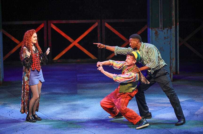 Director and designers lean hard into the nostalgia of the 1990s, and the result is rad. Neon splashes light up the set like a Nickelodeon game show. The costumes and dropped slang call back to a time of pagers, cassette tapes, and “as if!” exclamations. When characters drop lines that wouldn’t be out of place on Saved by the Bell, the crowd howls. For elder millennials and Gen Xers (who might just now be reaching that golden stage where the kids can stay home with a babysitter!) it feels like a perfectly aimed invitation back to their own coming-of-age.