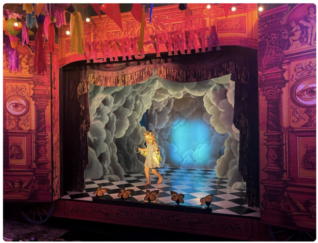 Multi-disciplinary artist David Israel Reynoso is an award-winning theatrical designer best known for his Obie Award-winning costume designs in Sleep No More and pioneering storytelling with his immersive theatre company OPTIKA MODERNA. Fellow adult fans will recognize nods to past projects. As the father of two young children (to whom he dedicates this work), Reynoso clearly understood the assignment. His signature mysterious aesthetic is not diluted, but it becomes welcoming to the smallest child when influenced by the colorful enigma that is a piñata.