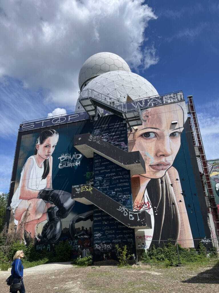 Coming up on the many steps leading to the viewing platform, a quadriga of murals greets the visitor. A giant black and white tiger seems to jump over the lower building next to a former radar tower. Two young girls put their fingers on their lips as if to warn the visitors: Be careful what you say, someone is listening. But the central mural shows a huge butterfly landing on the roof of a radar dome devouring the building. The theme of soft power overcoming the powers of war—in this case the Cold War listening towers— is a common theme in the murals on Teufelsberg.