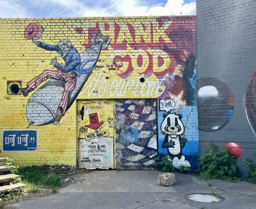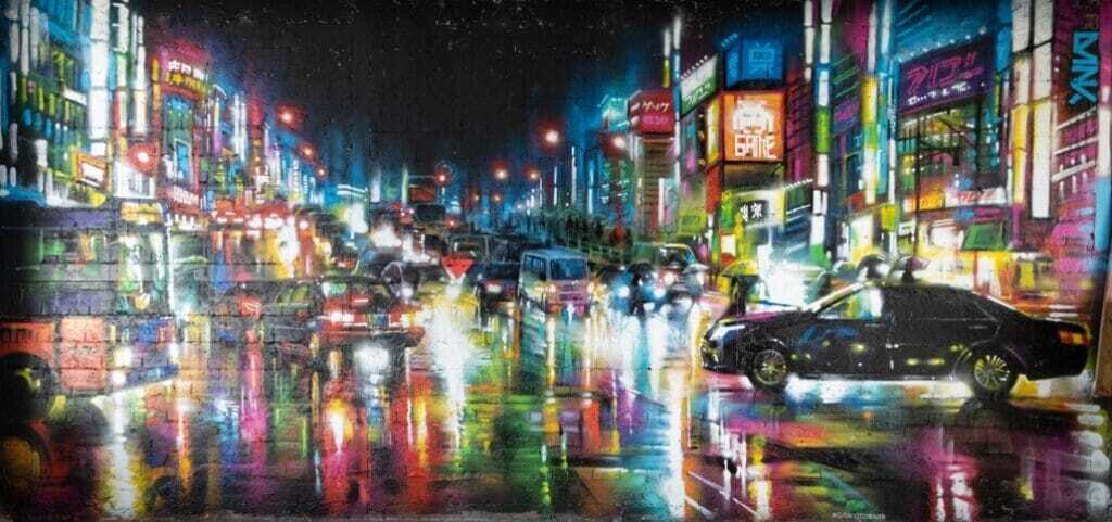 Inside the raw, open spaces of the street art Gallery, I found a piece of Tokyo in Berlin. The mural by the British Street Artist Dan Kitchener aka DANK, depicts a rain-soaked street illuminated by vibrant neon lights. The inspiration for this scene came from DANK’s nighttime strolls through Tokyo, where he photographed the streets in pouring rain to capture the perfect mood and perspective. He translated these impressions into his dynamic, colorful, modern-impressionist style image on Teufelsberg.