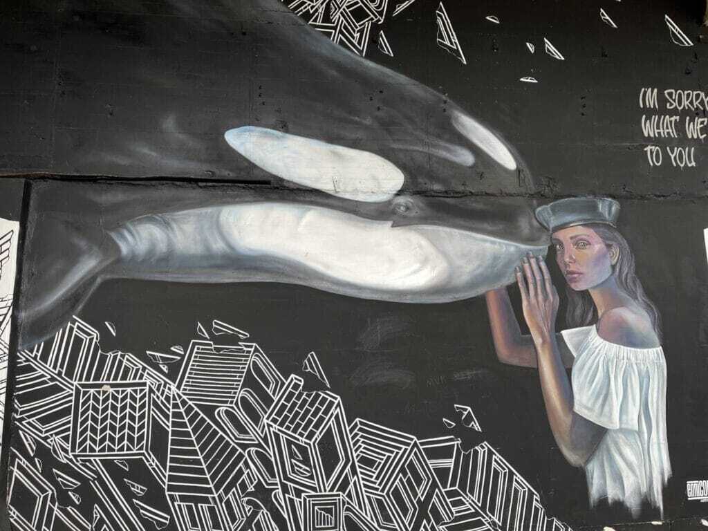 Not far from Kitchener’s work a mural by the artist duo ENNICOLOR shows a girl caressing a large orca whale. The caption reads, “I’m sorry for what we have done to you”. ENNICOLOR explain painting the entire background black, symbolizing the darkness of captive orcas. The protective figure of the woman can be perceived as either showing compassion, or being a sailor, who takes part in the industry capturing orcas. The orca is close to life size, which amplifies the impact of this mural.