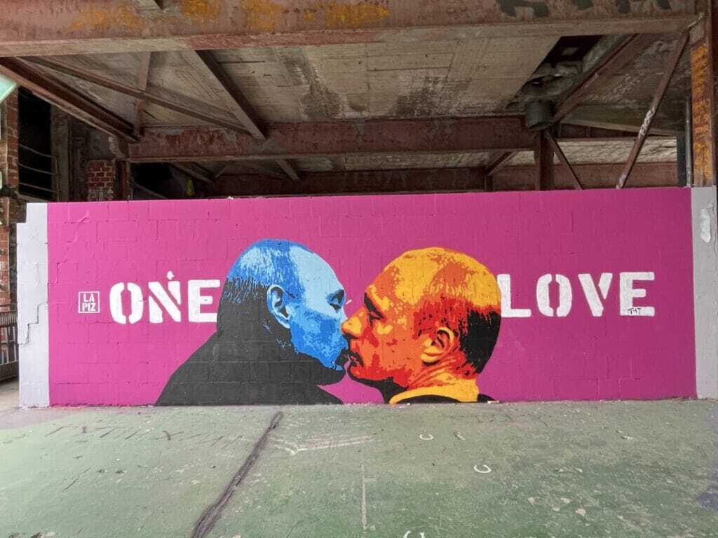 LAPIZ, a self-taught street artist from Berlin has painted One Love of Putin kissing himself. A symbol of unbridled self-love and self-absorption of the Russian leader. Here in Berlin the threat of Putin’s expansionism is felt very clearly. Russia is not far away.