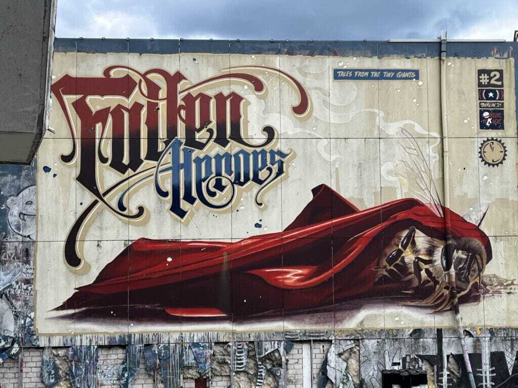 In Tales from the Tiny Giants by Berlin 21, an organization with sustainability and environmental goals, a giant bee has fallen. The Caption reads Fallen Heroes, and the red cape partially covering the bee symbolizes her heroic battle. Her transparent wings protrude through the cape, and a pipe serves as her long tongue through which she drinks the nectar. A small clock above the bee’s head shows it’s five minutes to twelve. The environmental clock is ticking, and time is running out. Bees have been dying in alarming numbers due to pesticides and disappearing habitat. Seeing the fuzzy body of a bee enlarged a hundredfold, makes this mural especially powerful.