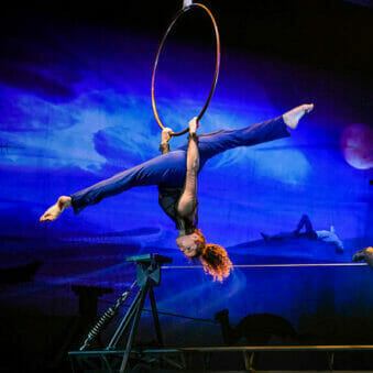 The show has many hallmarks of the Big Top, but players – such as Mandi Orozco – appear to be her own ringmaster when navigating emotion and aerial silks. Skipping the gazey glamour of Cirque du Soleil’s rhinestone leotards with vintage looks and austere, side-sculpting lighting dignifies the artists and elevates the art form.