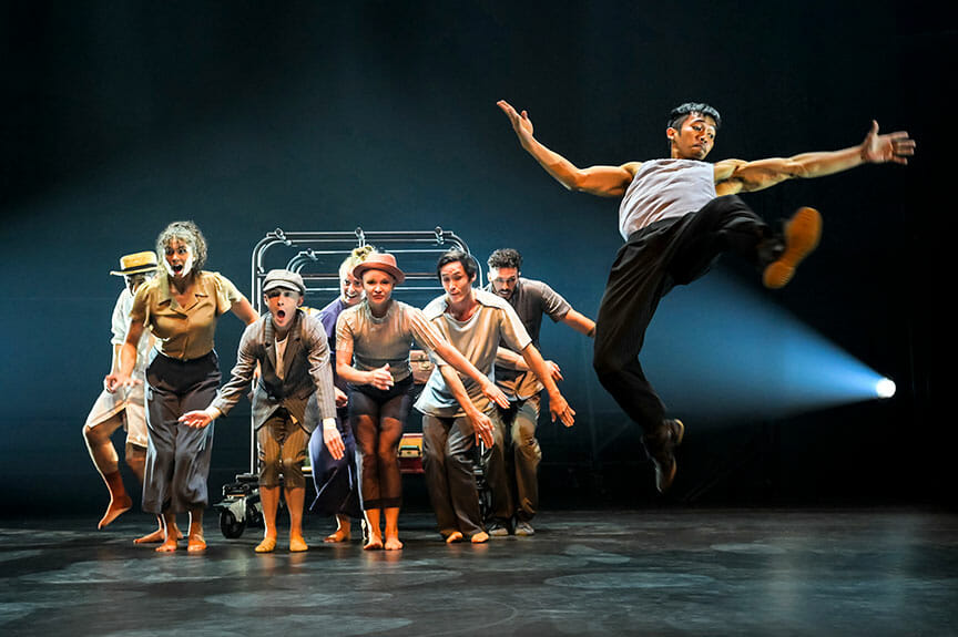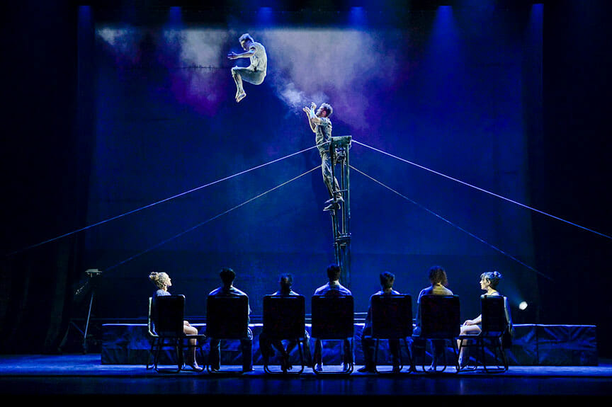 I am a former theatre marketer, and defining a show in one sentence is my habit. Word combinations tumbled through my brain like the acrobats onstage as I watched The 7 Fingers’ Passengers. A stylized, cathartic circus? Modern-dance-meets- storytelling-gymnasts? Then the adjectives stopped. So did my breath. One cannot worry about adjectives when witnessing the suspension of gravity.