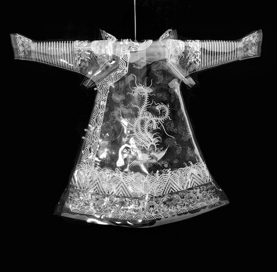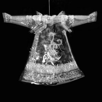 Many artists of the era became interested in art categories that were previously unknown in China before its government began establishing pseudo-capitalist economies along its Eastern coast. Performance artist Wang Jin created replica Qing Imperial robes—made of polyvinyl chloride plastic (PVC) and fishing line–that he wore in a performance entitled Chinese Dream (1998). Of course, China has a long tradition of esoteric drama, but these robes are also representatives of a new predilection among artists like Wang Jin to reconstitute historical references, in expendable consumer materials like plastic.