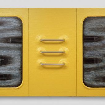 Tsu’s background in architecture and work as a word processor come to bear in his work which uses the shape and size of computer screens or TV monitors, a powerful medium of how we experience the world. His sculptures like Autopsy (1988) and Vertical Ooze (1987) use a landscape of ceramic tiles and painted wood to create multi-layered modular units that may refer to a utilitarian use and to the building blocks of technology in general.