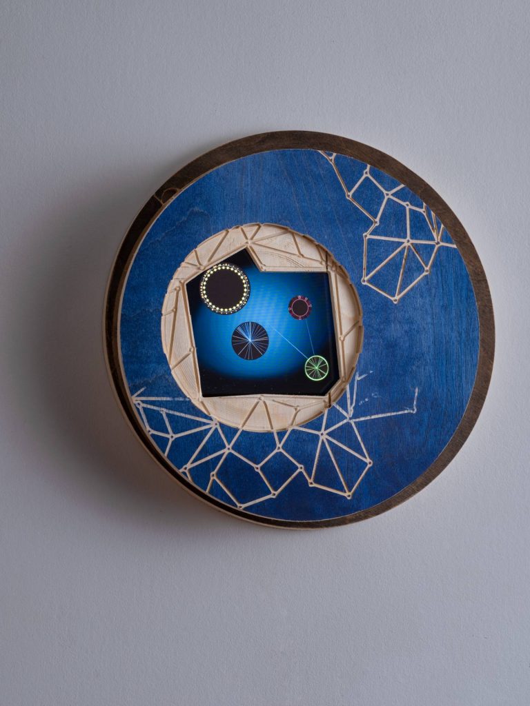These include such works as Allochronic Cycles from the Lois and Cesar Collective, in which we’re presented with a series of moving, clocklike objects made to represent the different timescales of humans, plants, viruses, and the universe. All have rotating faces except for one: Its face is digital, and contains a moving image of each of the others. This represents AI and its potential to unify these timescales under one system, as inspired by Dr. Joanne Chory’s research on timescales through the Arabidopsis plant and its uniquely adaptive internal clock.