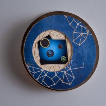Trifecta: Art, Science, Patron opened on the stormy evening of September 25th at the La Jolla Historical Society. It is the third of curator Chi Essary’s exhibitions concerning the meeting of art and science – a collaboration between ten pairs of artists and chaired scientists at the Salk Institute for Biological Studies. As the name implies, this exhibition includes the issue of patronage – a vital issue for the artist and scientist both. In particular, this exhibition honors the philanthropy of the Jacob Chair Challenge, which has provided millions of dollars in funding for Salk and has been responsible for the endowment of 18 out of Salk’s 31 chairs. The works populating the exhibition explore some of the mysteries and exciting possibilities lying at the cutting edge of biological research at Salk, as interpreted through the artistic lens.