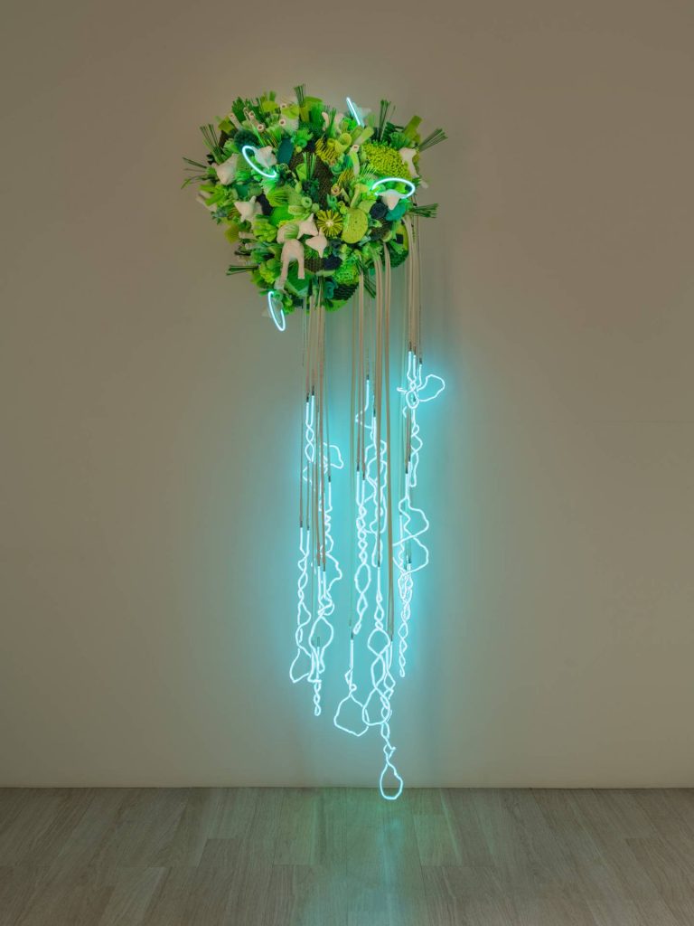 David Adey’s Fountainhead is an organic-looking representation of the living cell using cleaning products and ceramic lambs, with dangling fluorescent lights that represent “telomeres” (the caps of our chromosomes). This is inspired by Dr. Jan Karlseder’s research on the paradoxical relationship of telomeres with aging and cancer – the shortening of telomeres prevents cancer but ensures our mortality, elongated telomeres render a cell functionally immortal but are characteristic of cancer cells. Through telomeres, we may find the cure to aging in cancer.